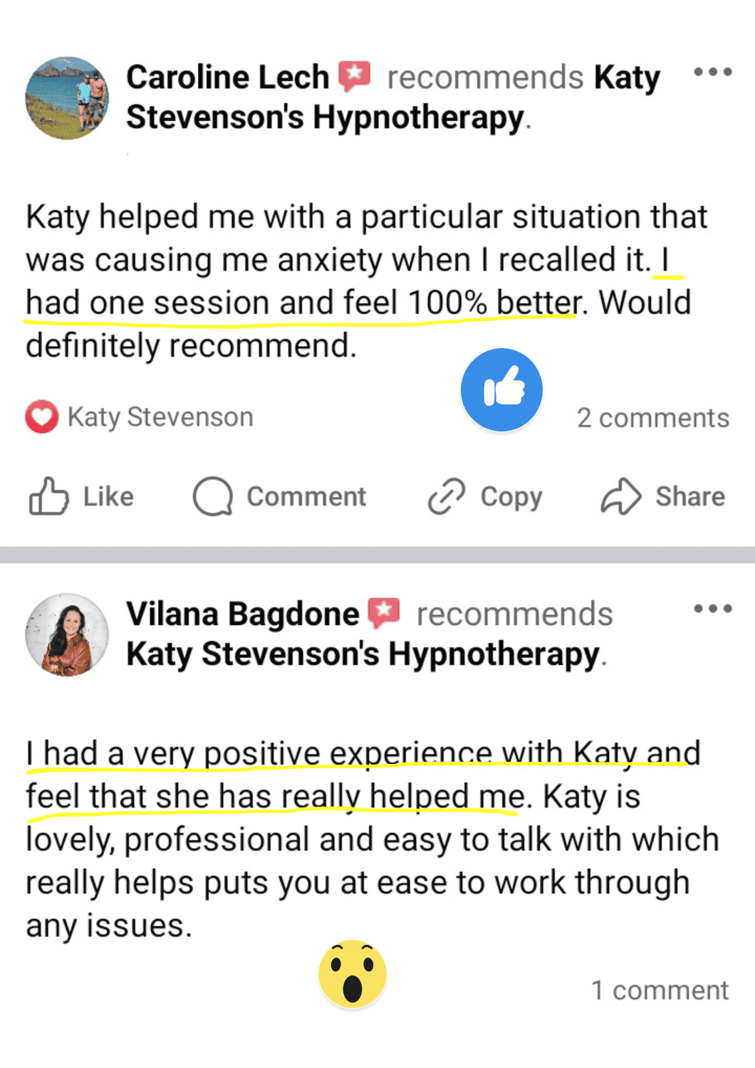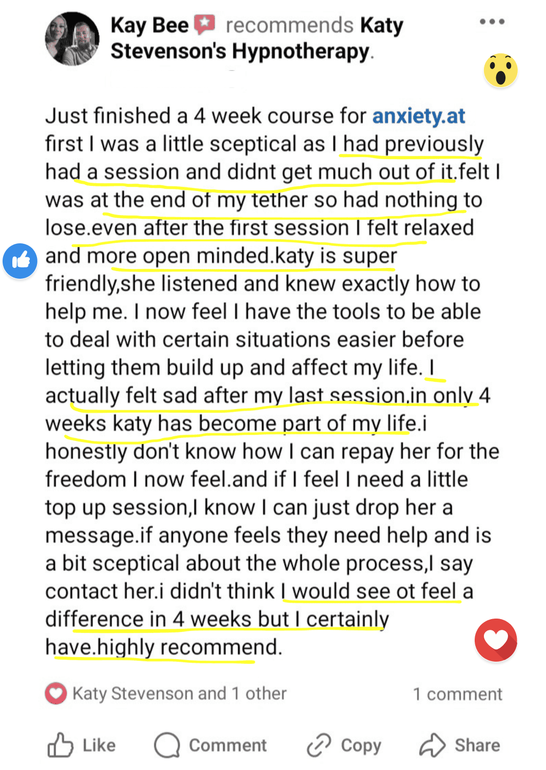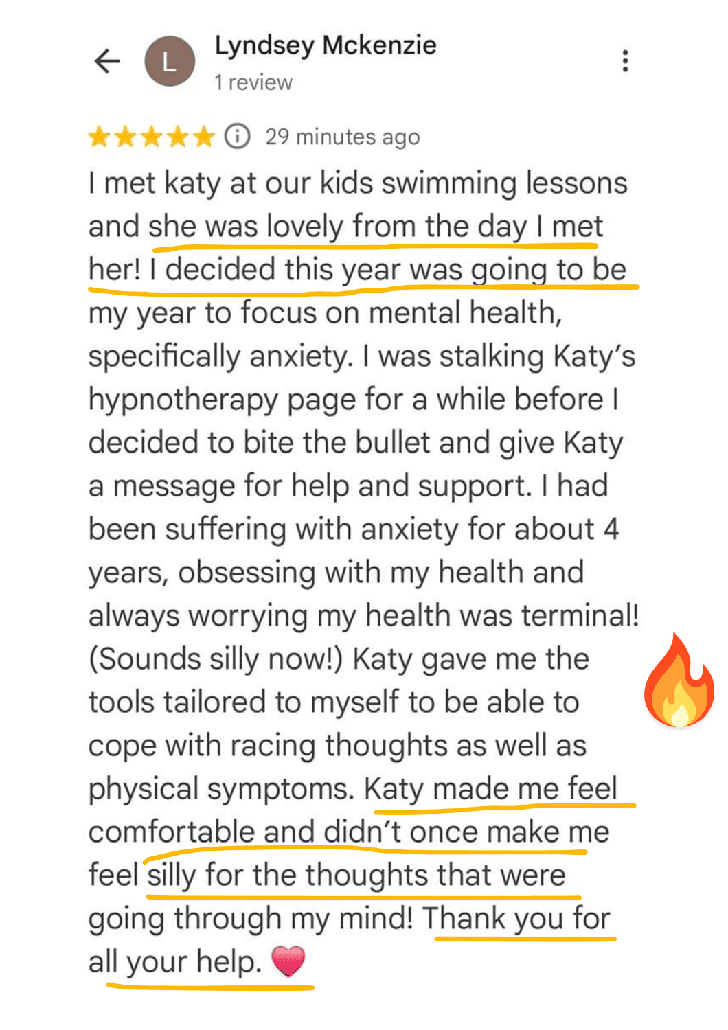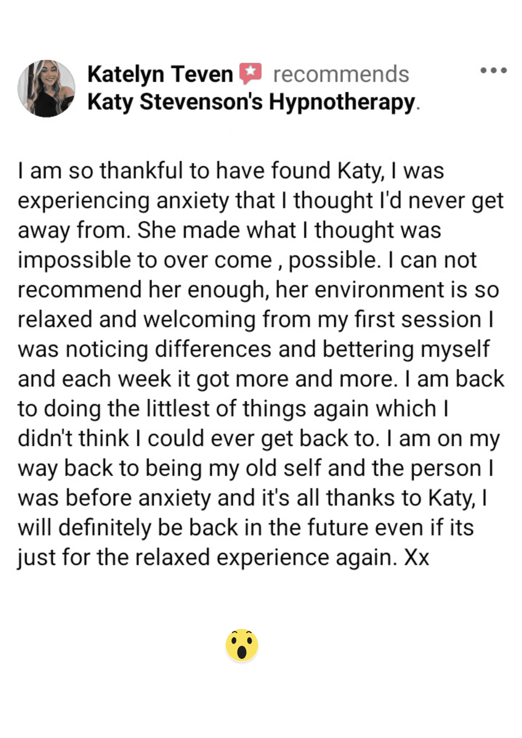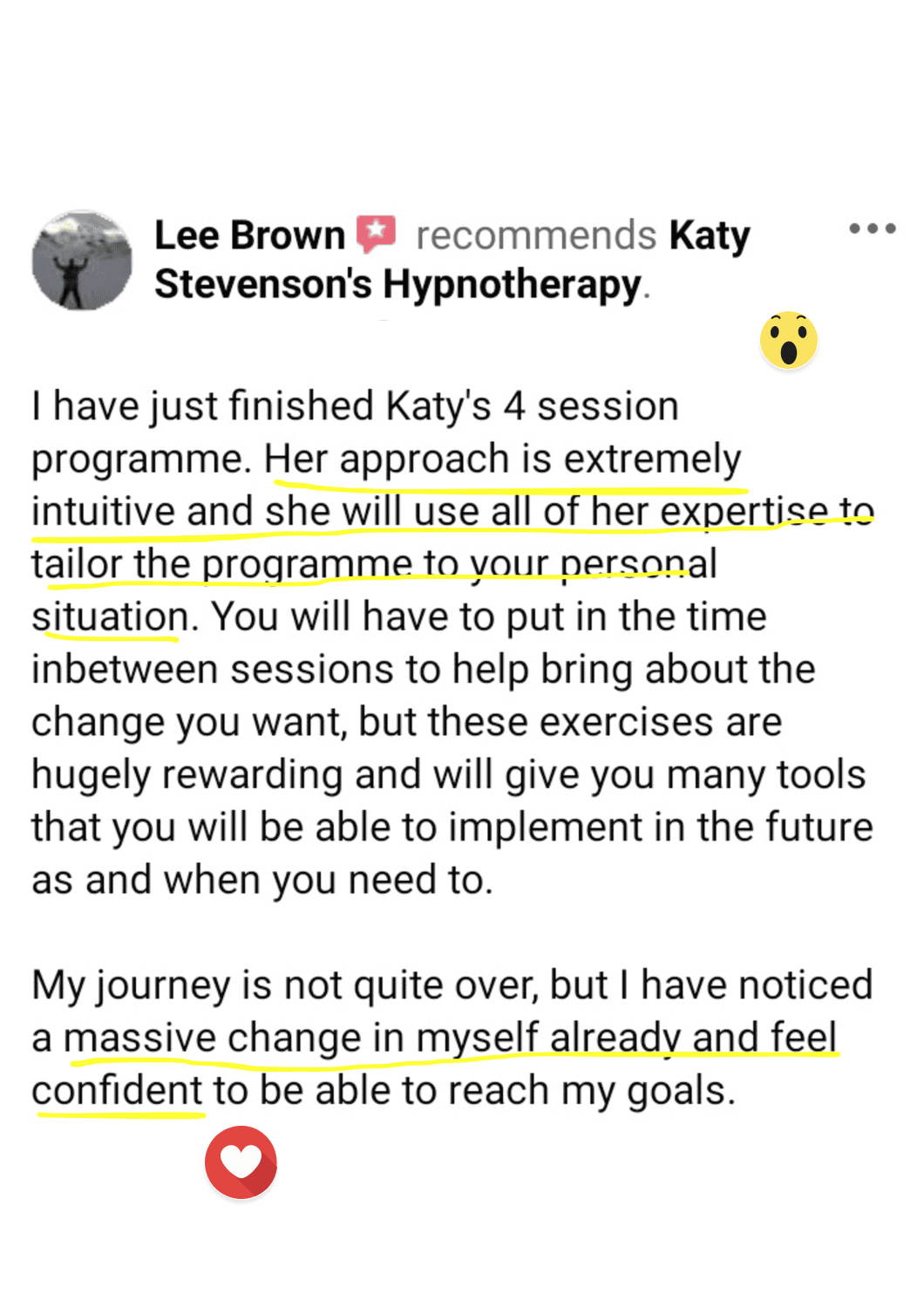 And to anyone considering it — I 100% recommend Katy. I honestly didn’t think anything would ever work… but just four sessions with her have completely changed my life.