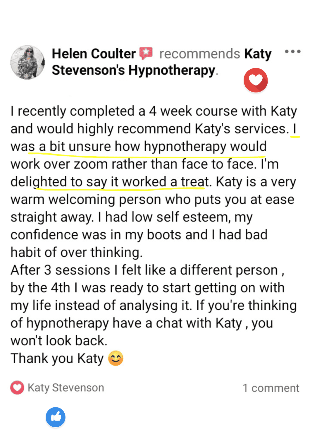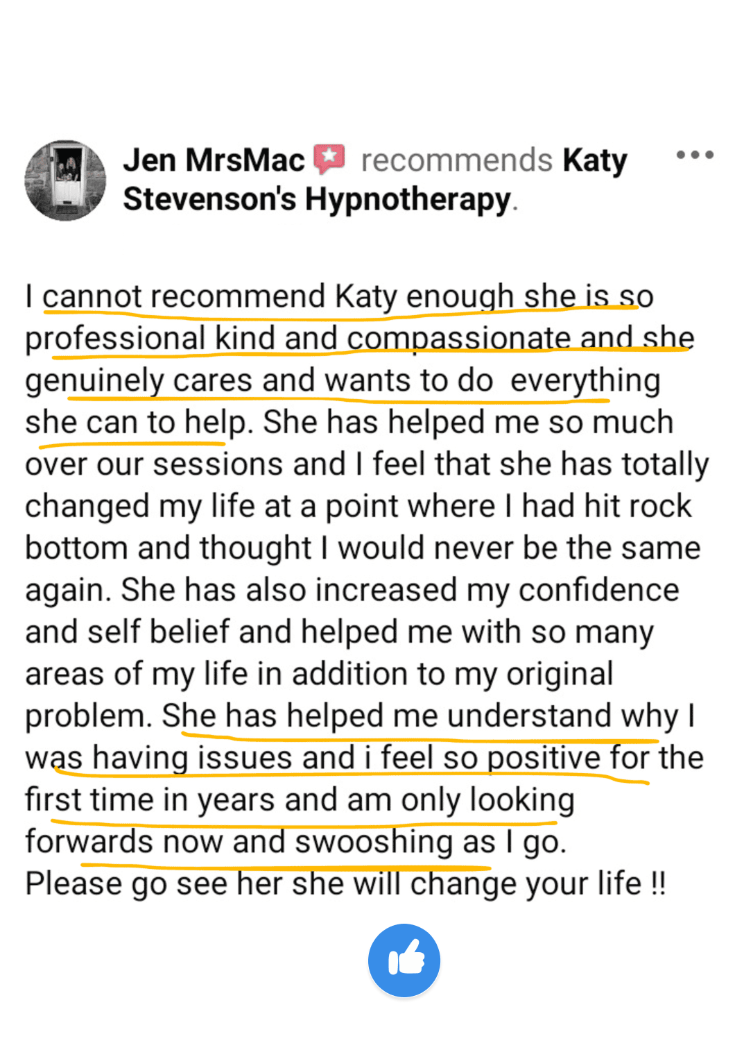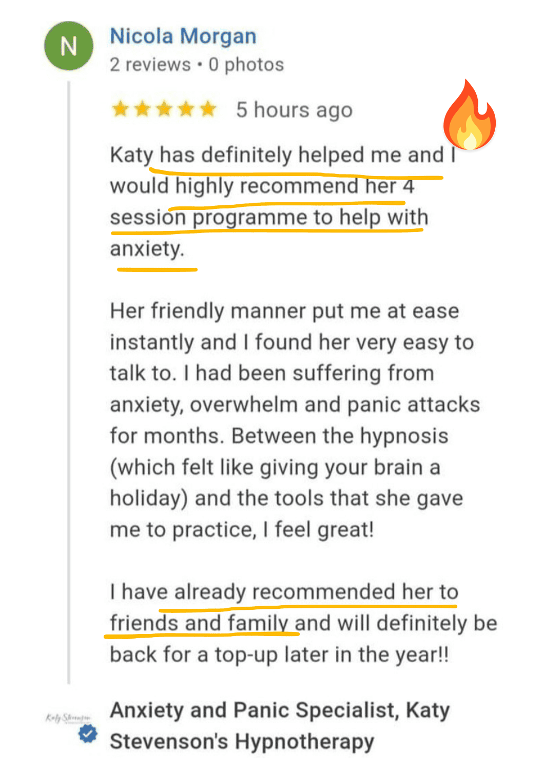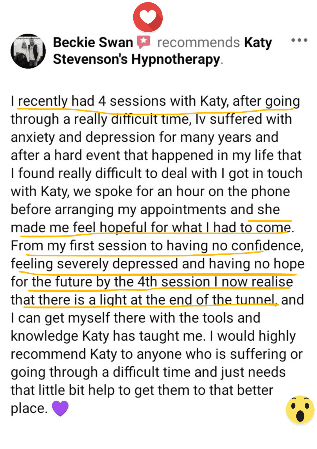 And to anyone considering it — I 100% recommend Katy. I honestly didn’t think anything would ever work… but just four sessions with her have completely changed my life.