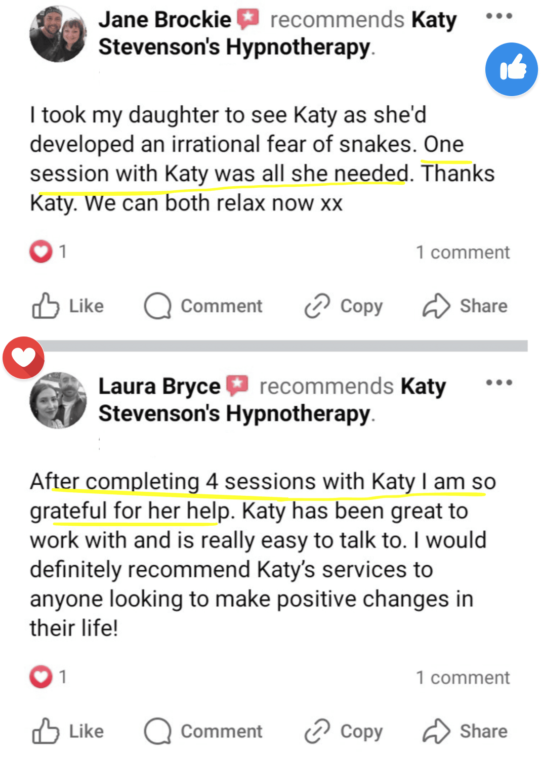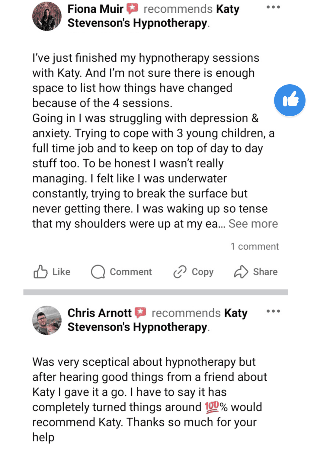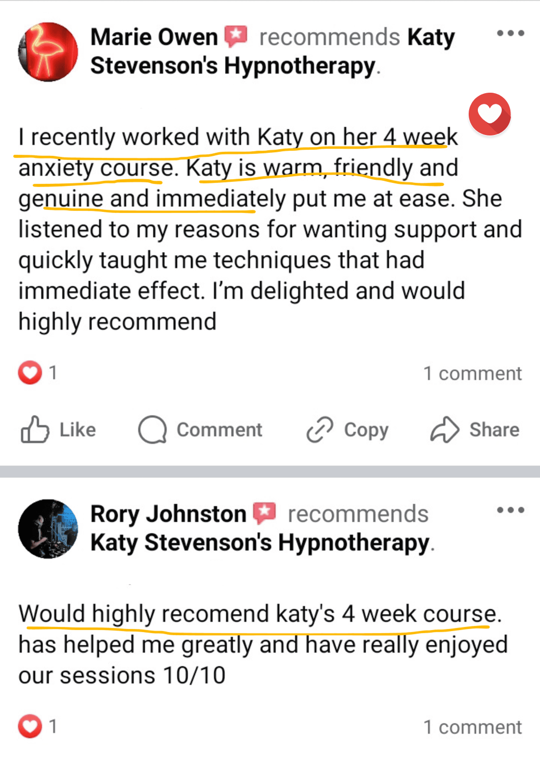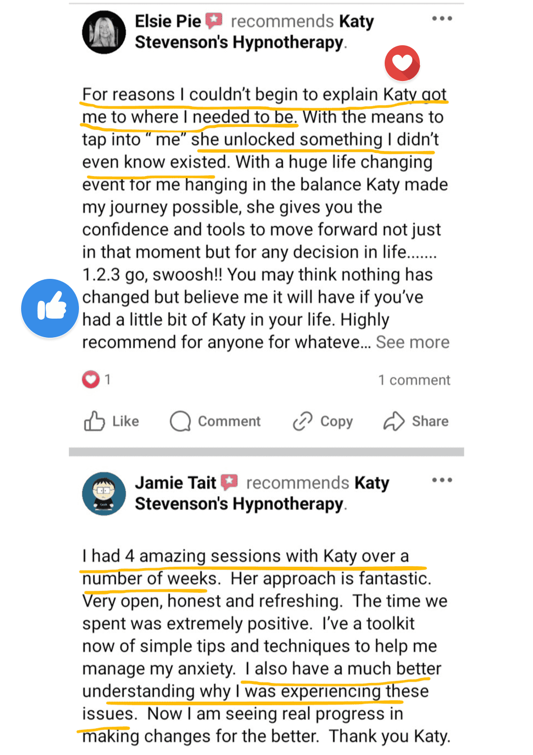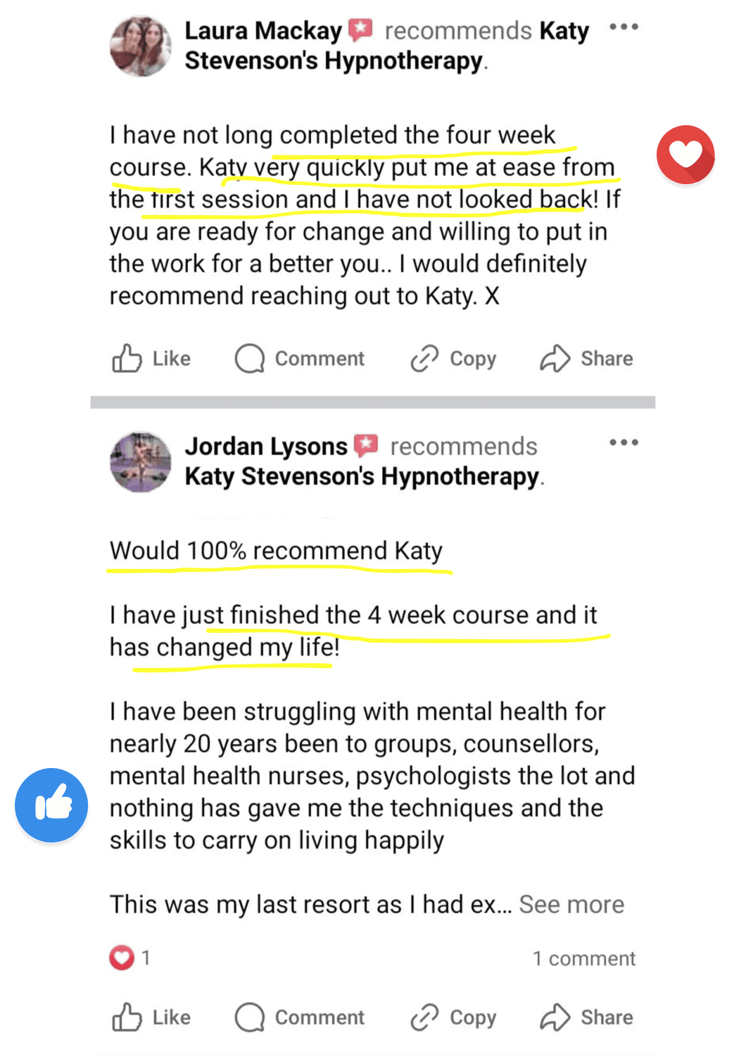 And to anyone considering it — I 100% recommend Katy. I honestly didn’t think anything would ever work… but just four sessions with her have completely changed my life.